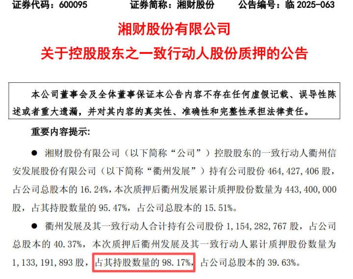 此外,记者注意到,湘财股份实控人黄伟所控制的“新湖系”深陷债务困境,截至目前其一致行动人质押湘财股份股权比例高达98.17%,且多次转让股权抵债,股权稳定性存疑。