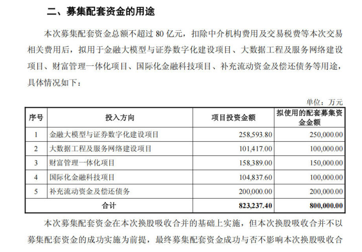 为支撑合并后业务发展,湘财股份同步推出配套融资方案:拟向不超过35名特定投资者非公开发行股票,募集资金总额不超过80亿元。从投入来看,金融大模型与证券数字化建设项目拟使用配套募集资金25亿元,大数据工程及服务网络建设项目拟投入10亿元,财富管理一体化项目拟投入15亿元散户配资,国际化金融科技项目拟投10亿元,补充流动资金及偿还债务则拟使用20亿元。